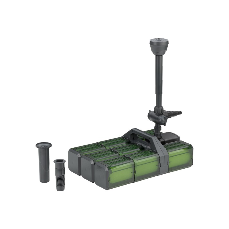 El EHEIM MODUL 4000 se compone de una bomba y de módulos filtrantes individuales que pueden añadirse o extraerse según sea necesario en función del tamaño del estanque o de la población de peces. Por lo tanto, puede adaptarlo a sus necesidades individuales. El MODUL 4000 también tiene una salida de agua ajustable por separado. Esto le permite operarlo en paralelo como una bomba para juegos de agua, crear un arroyo o conectar un esterilizador UVC. Y finalmente, también puede ser fácilmente escondido en aguas poco profundas. Porque es súper plano y se adapta discretamente a su entorno gracias a su color neutral.
