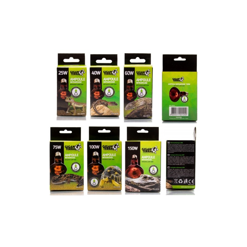 Las lámparas de calefacción por infrarrojos se pueden utilizar las 24 horas porque su dispersión de la luz es Filtración UVA. Son perfectas para la observación de especies nocturnas que requieren una graduacion térmica en la noche. También pueden utilizarse para aves y pequeños mamíferos. Tenga cuidado, esta lámpara calienta mucho y se debe utilizar un portalámparas E27 de cerámica para las mismas. Con el fin de evitar los riesgos de quemaduras, asegúrese de que su animal no puede alcanzar esa lámpara.
