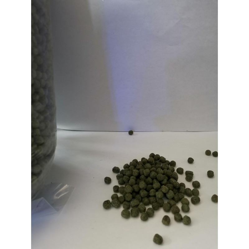 Alimento en formato pellet, de productos vegetales, rico en espirulina, contiene vitaminas y Antioxidantes
