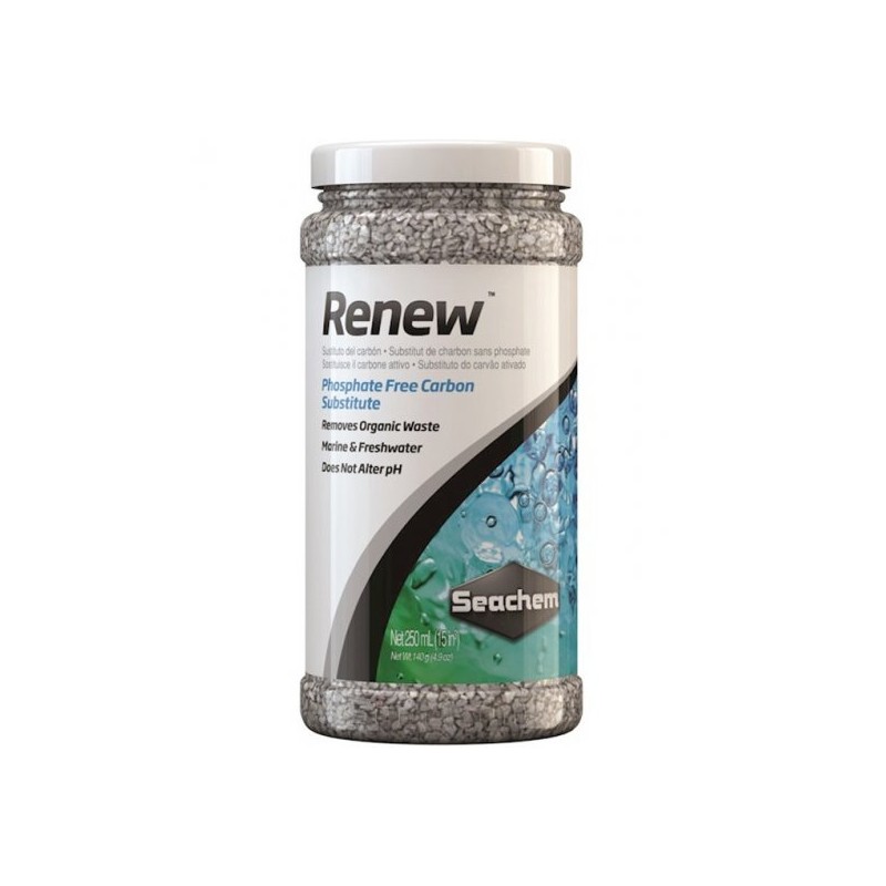 RENEW™ es ideal para el uso en sistemas dónde el fosfato liberado por carbones activados pueden ser un problema. Renew™ es también menos agresivo que el carbón, haciéndolo más adecuado para arrecifes y acuarios con plantas. Tiene también mejores consecuencias para el uso en acuarios de aguas blandas donde la propiedad de elevar el pH de muchos carbones no es un acierto. Renew™ retirará orgánicos y partículas en el rango de sub micras. Esto también ayudará a controlar amoniaco, nitratos y fosfatos.