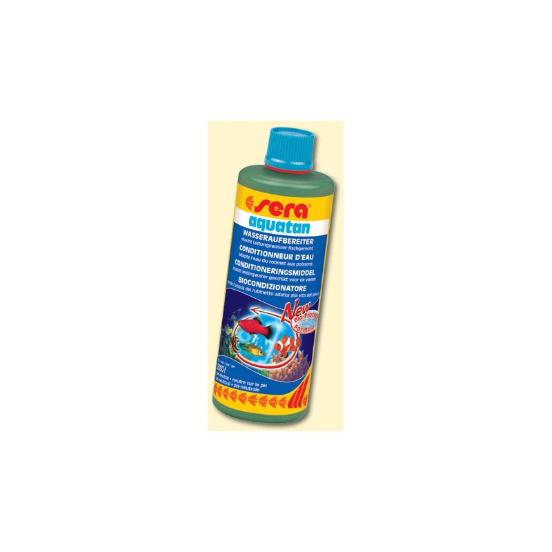 Ahora, SERA aquatan, con la nueva fórmula SERA Bio-Protect, elimina las sustancias perjudiciales de forma segura, acondiciona el agua del grifo al crear un nuevo acuario y en los cambios de agua de forma aún más adecuada para los peces y las plantas. Así se mejoran claramente las condiciones de vida de los peces, las plantas y los microorganismos en el acuario. Los peces lucen sus colores más atractivos y cuidar del acuario requiere poco esfuerzo.