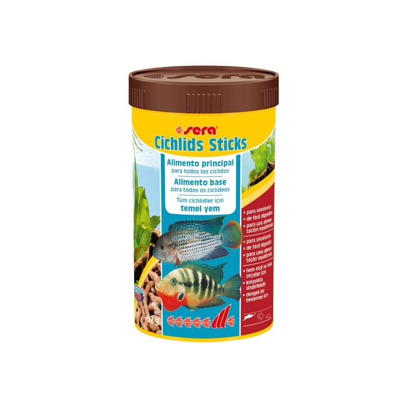 Sera Cichlids Sticks es el alimento principal que se compone de sticks cuidadosamente elaborados, para cíclidos omnívoros de tamaño grande – incluyendo muchas especies suramericanas – y otros peces grandes. Gracias al alto contenido de proteínas perfectamente utilizables y valioso germen de trigo, así como ácidos grasos Omega, los sticks resultan especialmente sabrosos y fácilmente digeribles. La alimentación equilibrada favorece la vitalidad y el desarrollo sano de los peces. Los sticks flotantes mantienen su forma y no contaminan el agua.