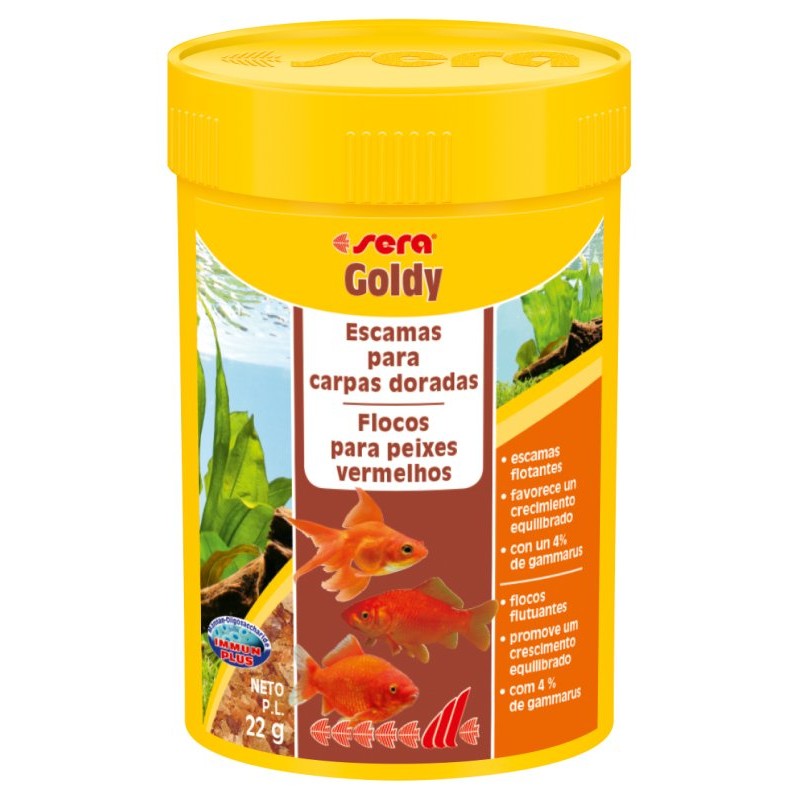 Sera Goldy es el alimento principal, que se compone de escamas cuidadosamente elaboradas, para carpas doradas pequeñas (incluso las variedades más dificiles) y otros peces exigentes de agua fría. Los ingredientes vegetales y animales seleccionados cuidadosamente – como gammarus (un 4%), que son ricos en oligoelementos y carotenoides –, son la base de un alimento atractivo, de fácil digestión, que favorece un crecimiento equilibrado, el sistema inmunitario y la vitalidad de estos peces vistosos. Puesto que las escamas, que mantienen su forma, flotan durante mucho tiempo, los peces se las comen por completo, de manera que no contaminan el agua.