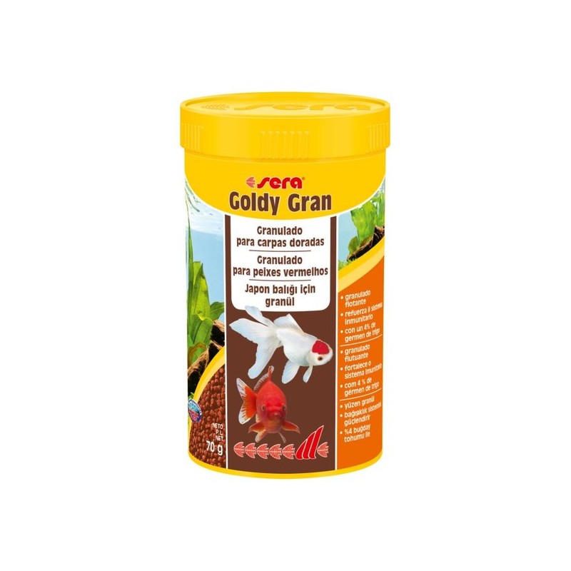 Sera Goldy Gran es el alimento principal que se compone de granulado cuidadosamente elaborado, para carpas doradas grandes y otros peces exigentes de agua fría. Gracias a sus ingredientes de alta calidad, como el germen de trigo (4%), ácidos grasos Omega y manano-oligosacáridos, este alimento es fácilmente digerible y suministra todos los nutrientes necesarios, incluso a las variedades más exigentes. De esta manera, asegura un buen crecimiento de los peces, sin que engorden, y un sistema inmunitario fuerte. El granulado flotante, que mantiene su forma, no contamina el agua.
