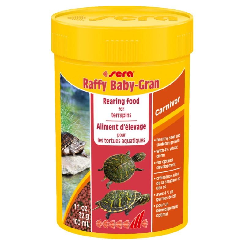 Sera Raffy Baby-Gran es el alimento de cría que se compone de un granulado cuidadosamente elaborado, para reptiles carnívoros jóvenes, como tortugas acuáticas pequeñas.
